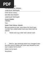 Surat kiriman rasmi seperti surat tidak hadir ke sekolah adalah perutusan. Contoh surat tidak hadir ke sekolah kerana (cuti sakit & . Antara alasan yang diberikan oleh ibu bapa atau pelajar adalah demam, sakit, masalah keluarga dan sebagainya. Memohon pengecualian kehadiran anak ke sekolah disebabkan Oleh itu, saya memohon maaf di atas ketidak hadiran anak saya ke sekolah. Di tingkatan 3m, ingin memohon cuti untuk anak saya pada tarikh tersebut.